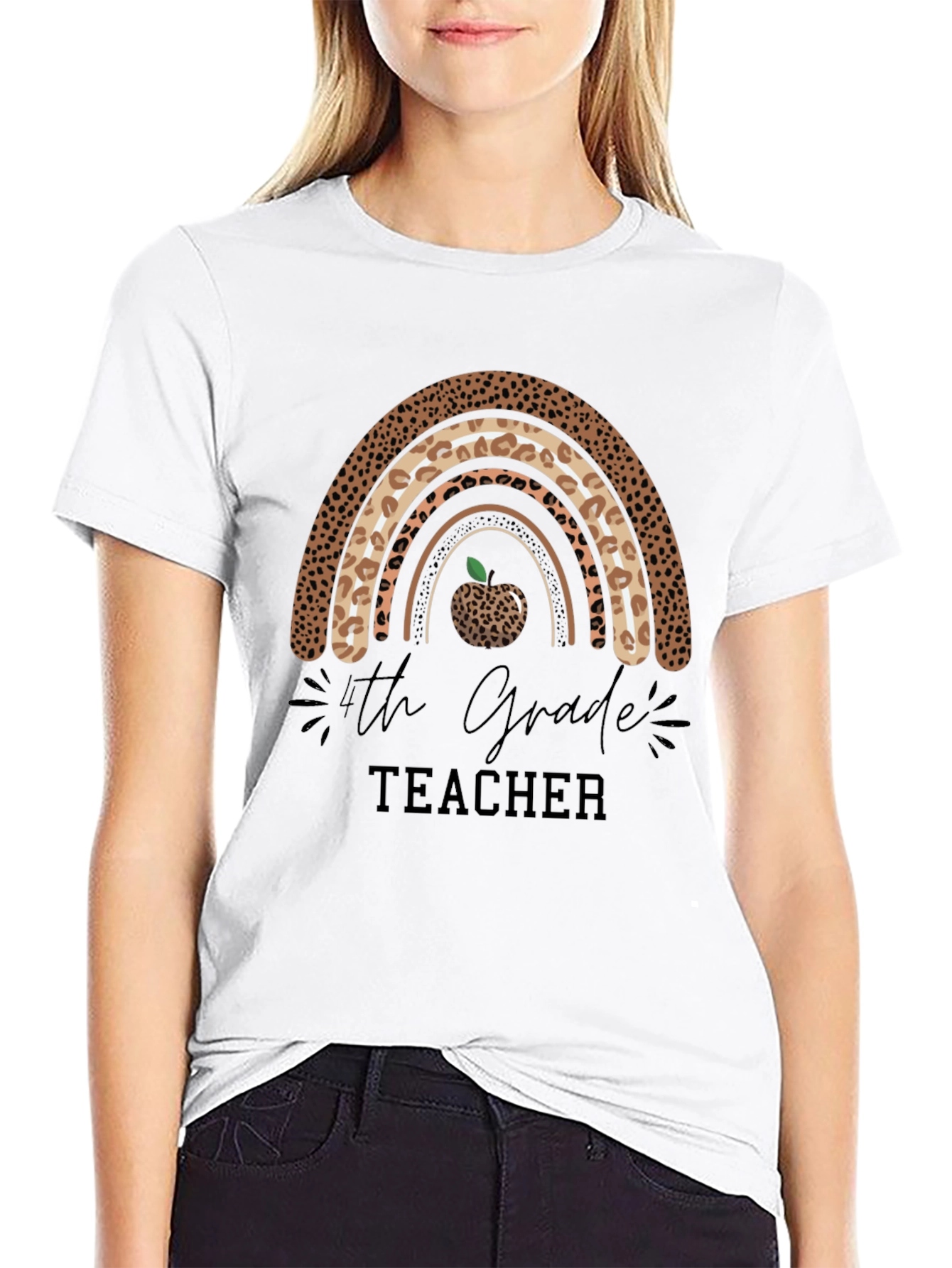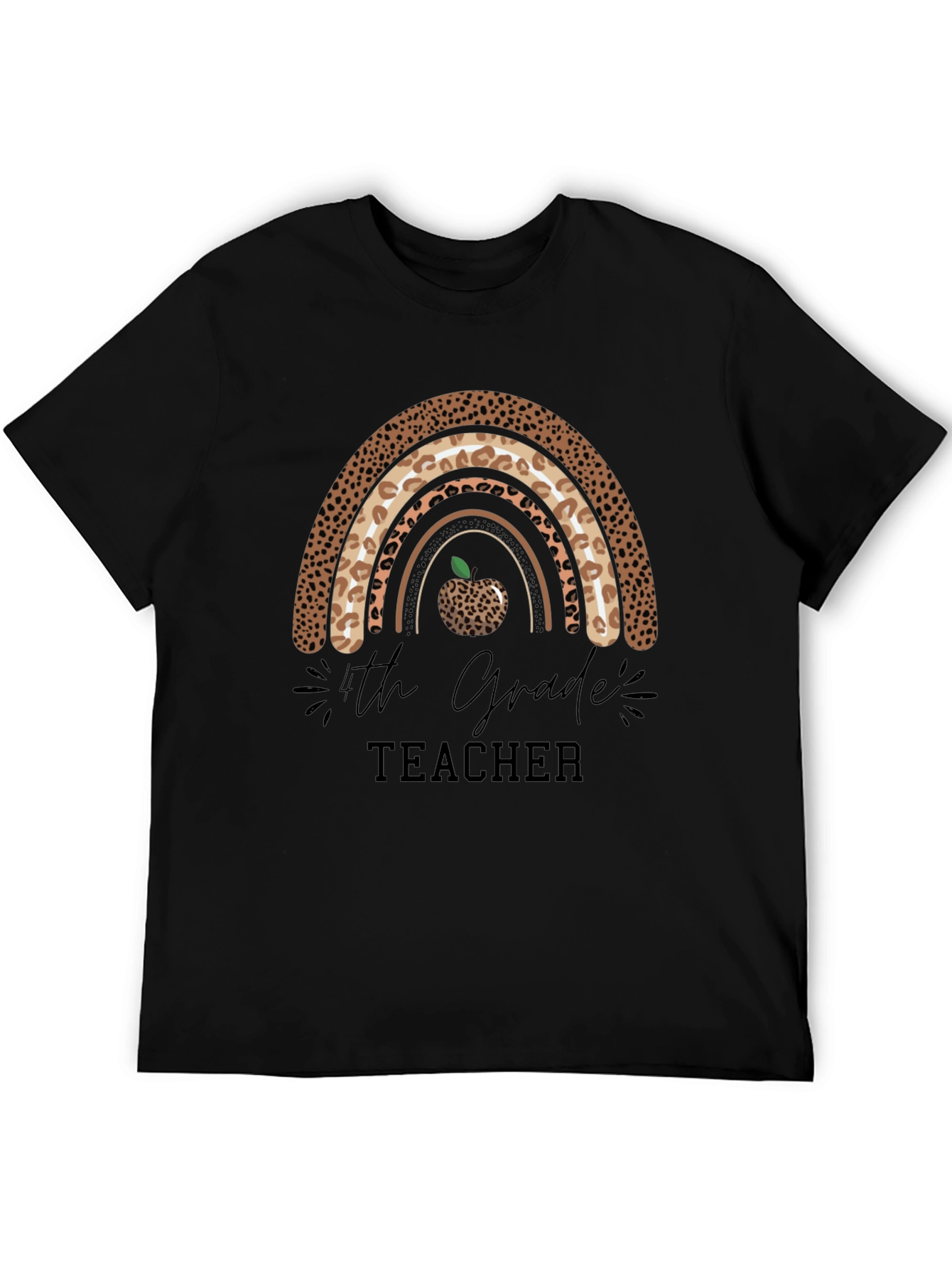 Show your appreciation for teachers with this stylish black t-shirt! Featuring a trendy leopard print rainbow design, this shirt is perfect for 4th grade educators. An apple graphic is integrated into the rainbow design. This comfortable tee is ideal for wearing to school, casual outings, or teacher appreciation events. Makes a thoughtful and fashionable gift for the special teachers in your life. The shirt's high-quality print ensures long-lasting vibrancy. Get yours today and let your teacher pride shine!