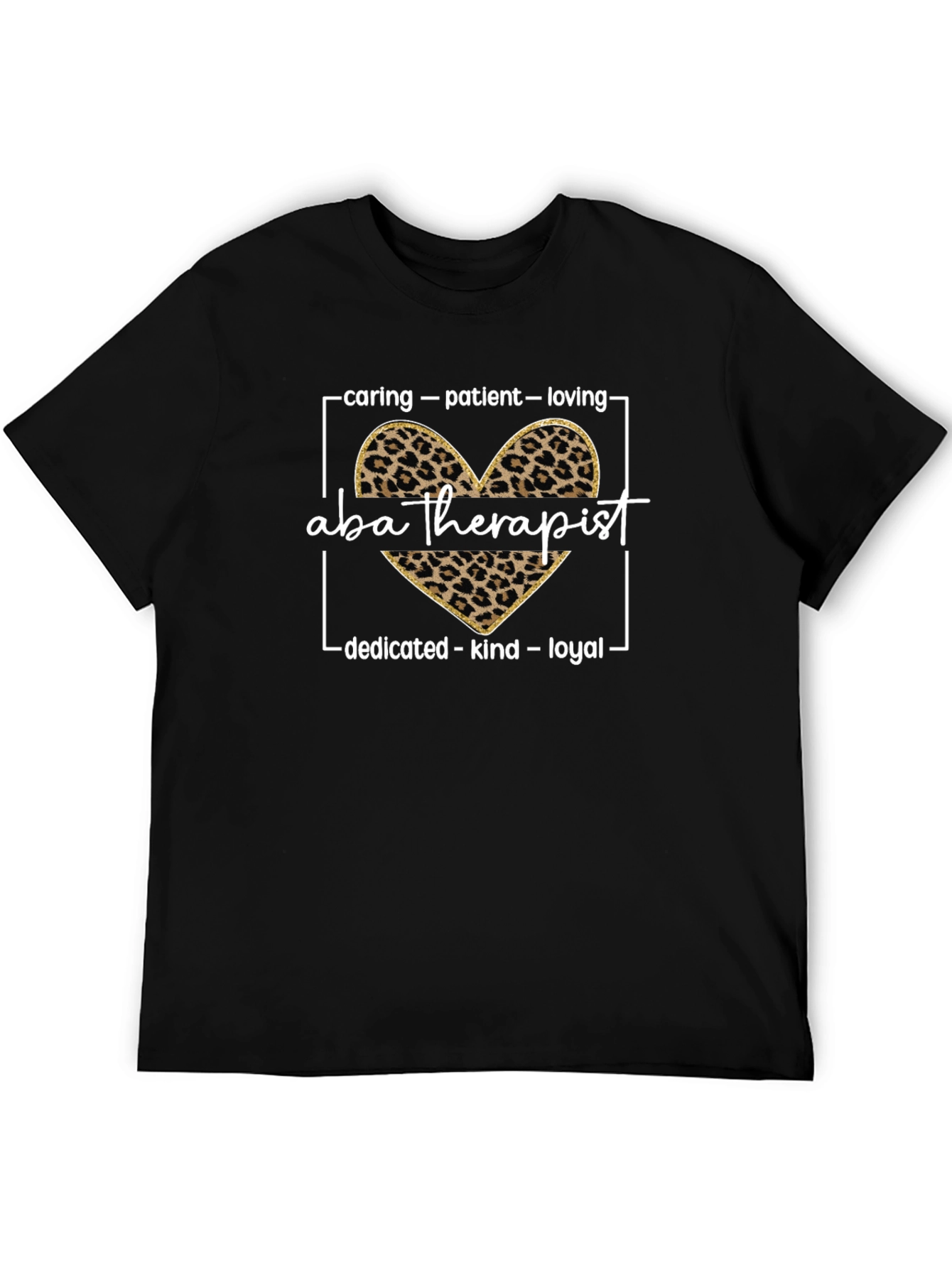 Show your appreciation for ABA therapists with this stylish black t-shirt. The design features a leopard print heart with the words 'aba therapist' in elegant white script. Encased in a square with 'caring, patient, loving' above and 'dedicated, kind, loyal' below the heart. This tee is perfect for wearing to work, casual outings, or as a thoughtful gift for the ABA therapist in your life. Made from a comfortable material, it's both fashionable and functional, allowing you to support a great cause with style. Get yours today and spread the love!