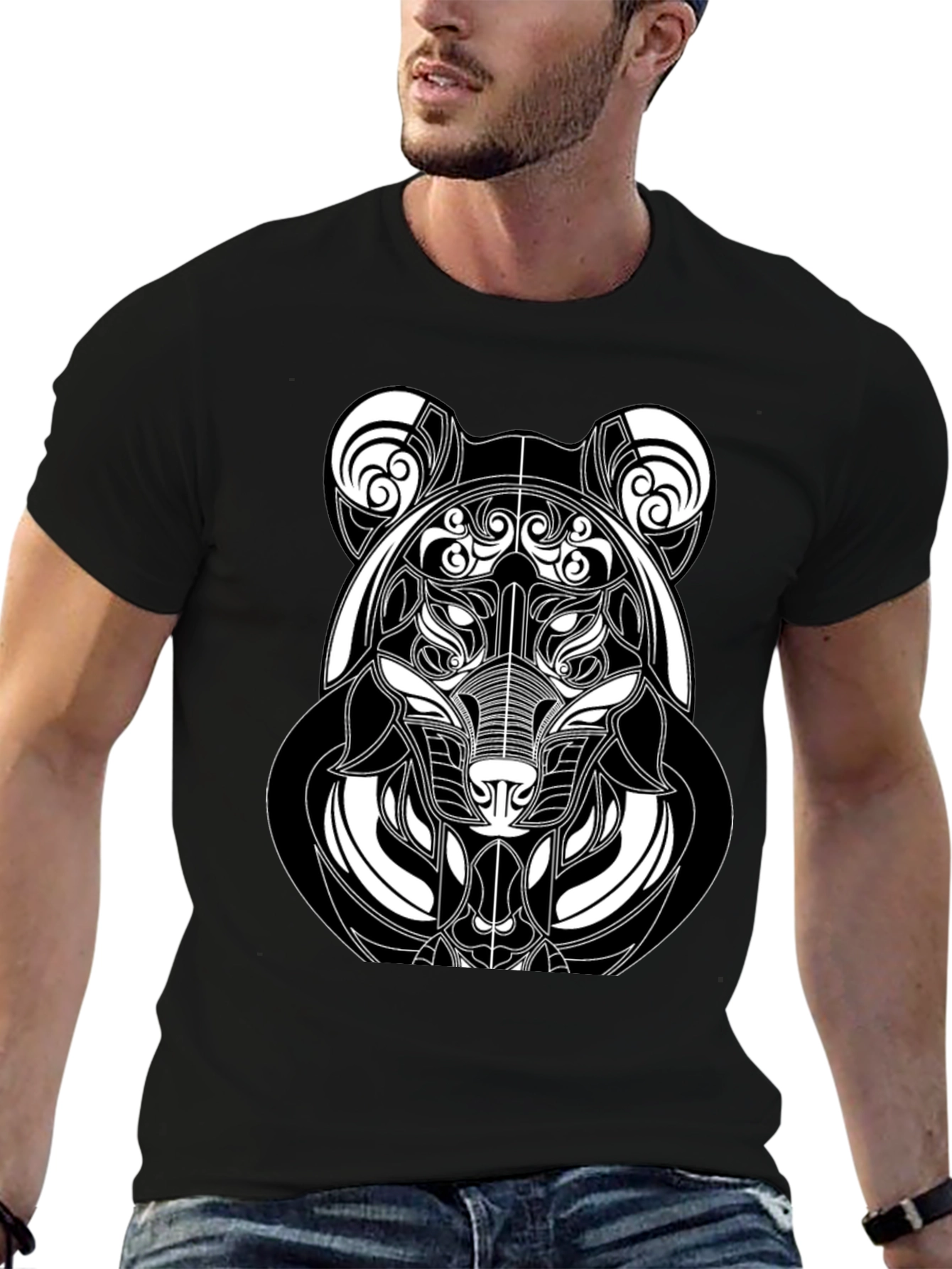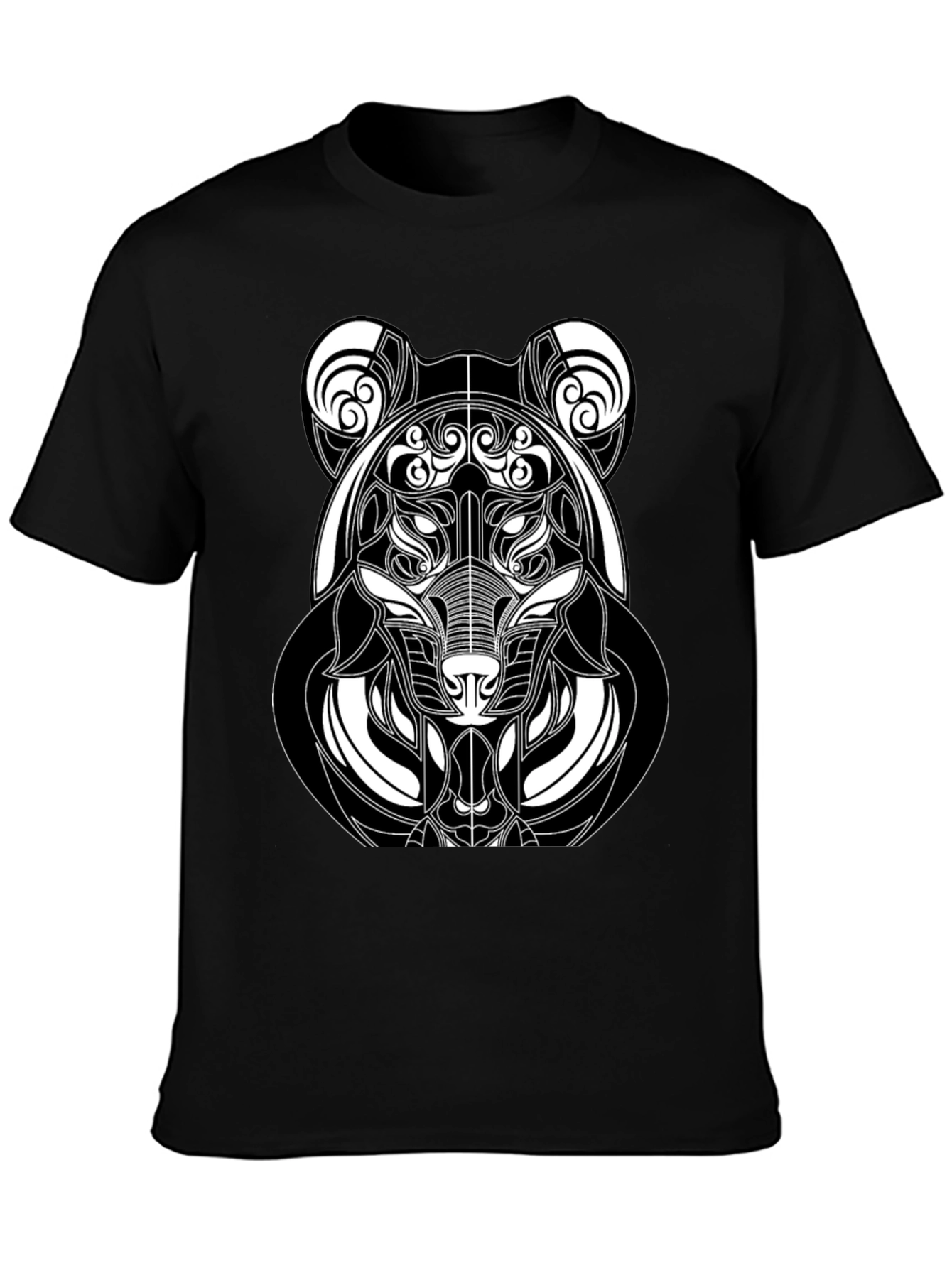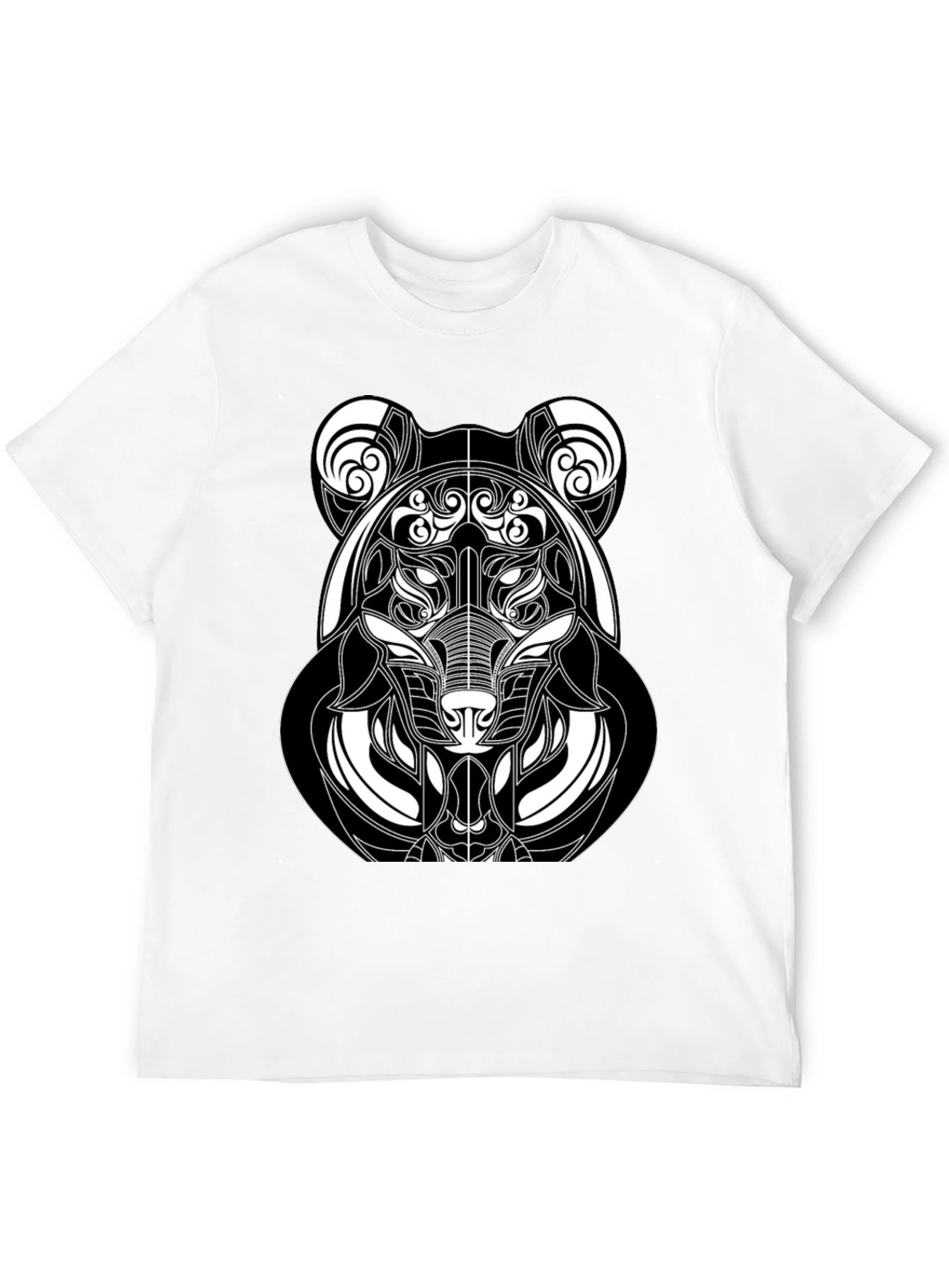 Show off your unique style with this black graphic tee featuring a striking abstract bear design. The intricate white linework creates a captivating image, perfect for adding an artistic edge to your casual look. Made from a comfortable and durable fabric, this t-shirt is ideal for everyday wear or making a statement at social gatherings. Pair it with jeans or shorts for a versatile and stylish outfit. Upgrade your wardrobe with this eye-catching and trendy piece.
