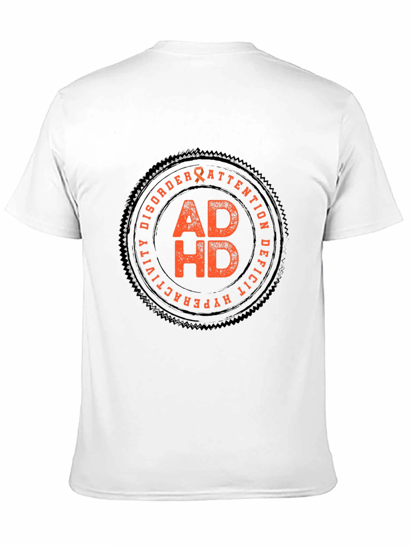 Show your support with this ADHD awareness t-shirt. This black tee features a distressed circular design with the letters "ADHD" prominently displayed in orange. The design includes the full phrase "Attention Deficit Hyperactivity Disorder" around the edges. The shirt is made from a comfortable, breathable fabric, perfect for everyday wear or awareness events. Support a cause with this stylish and meaningful t-shirt!
