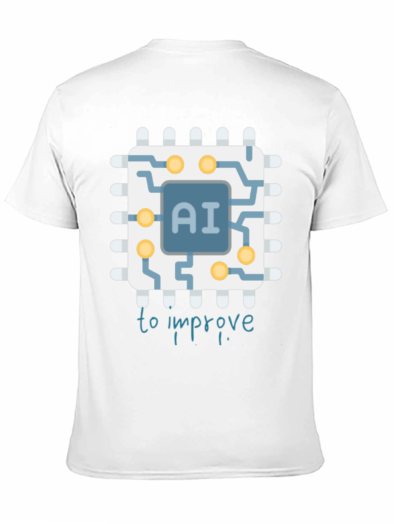 Show your love for technology with this stylish AI-themed t-shirt. The black tee features a unique graphic of a microchip with 'AI' in the center and the phrase 'to improve.' This shirt is perfect for anyone interested in artificial intelligence, computer science, or technology in general. The design is eye-catching and sure to spark conversation. Made with soft, comfortable materials, this shirt is perfect for everyday wear. Whether you're coding, attending a tech conference, or just hanging out, this AI t-shirt is a great way to express your passion.