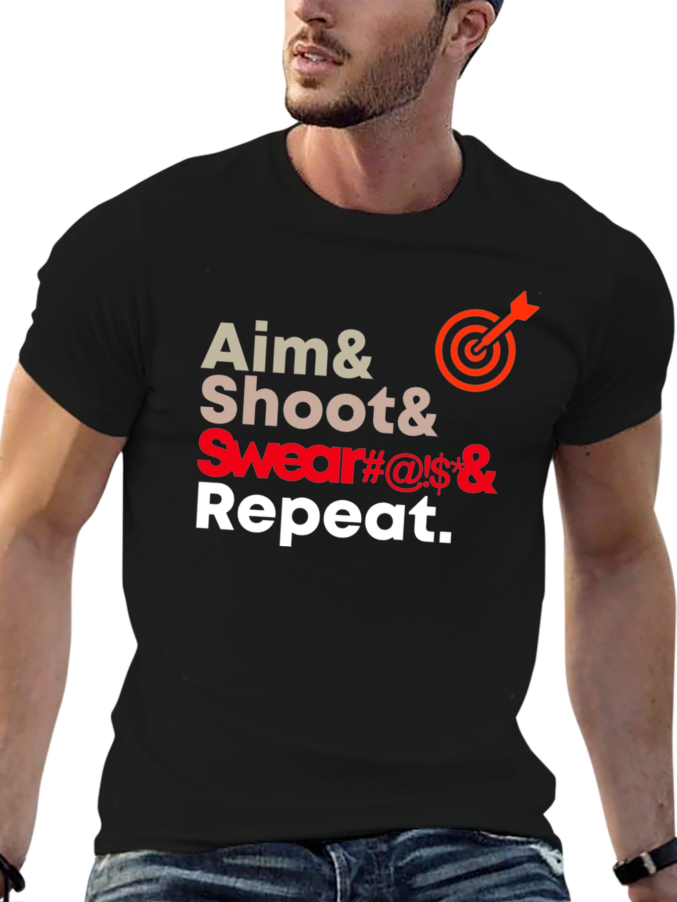 This black t-shirt features a humorous design with the phrase 'Aim & Shoot & Swear#@!$& & Repeat.' The words are stacked vertically, with 'Aim' in a light beige color, 'Shoot' in a slightly darker beige, and 'Swear' in a striking red. A target symbol with an arrow replaces the ampersand after 'Aim.' The text is bold and easy to read, making the message clear and eye-catching. The shirt appears to be made of a comfortable cotton blend, ideal for casual wear. Perfect for anyone with a sense of humor who enjoys shooting or target practice. Show off your quirky side with this unique and conversation-starting t-shirt.