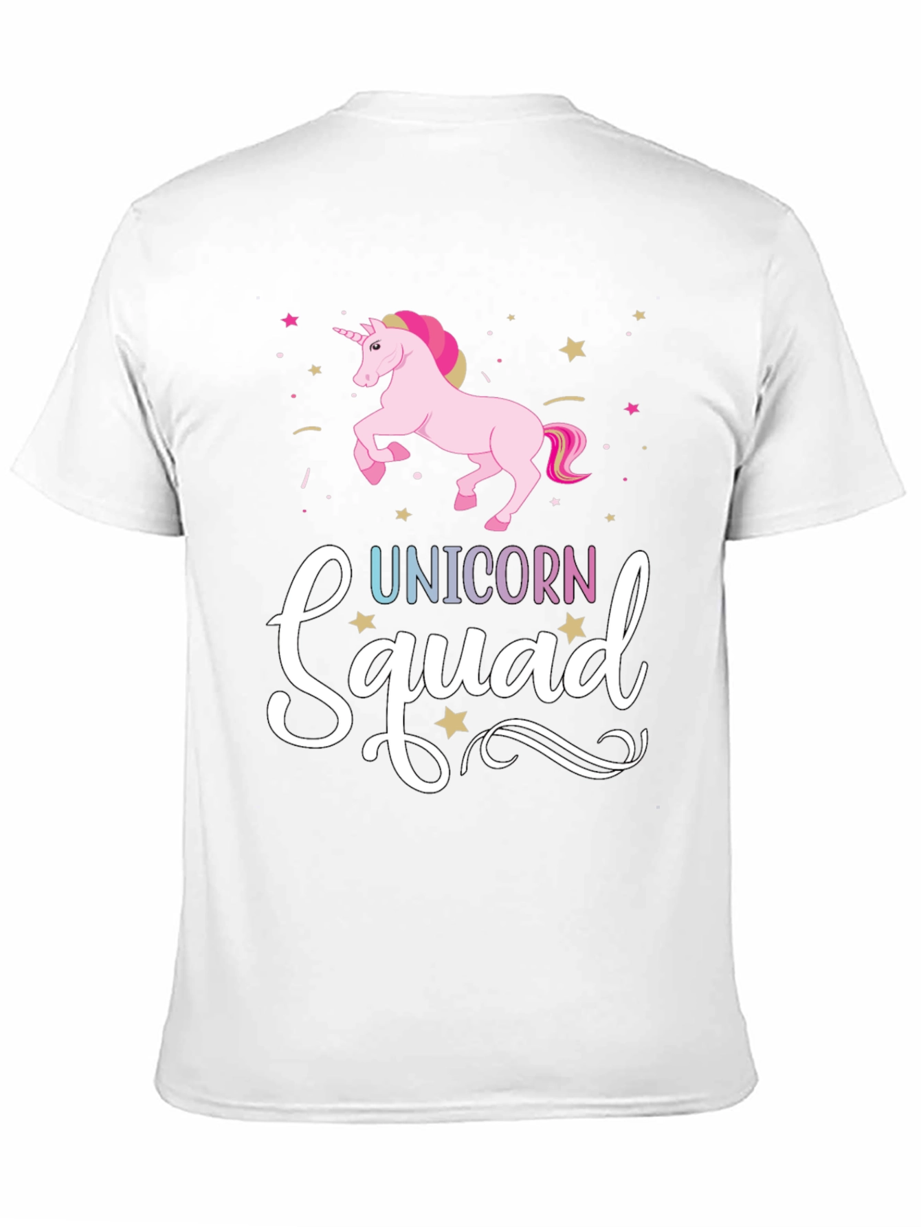 Show your love for unicorns with this stylish black graphic tee! The shirt features a vibrant design of a pink unicorn surrounded by colorful stars, above the words "Unicorn Squad" in a playful, eye-catching font. The whimsical design is perfect for casual wear, parties, or as a fun gift for unicorn enthusiasts. Made from comfortable materials, this tee is soft and breathable. Add a touch of magic to your wardrobe with this unique statement piece!