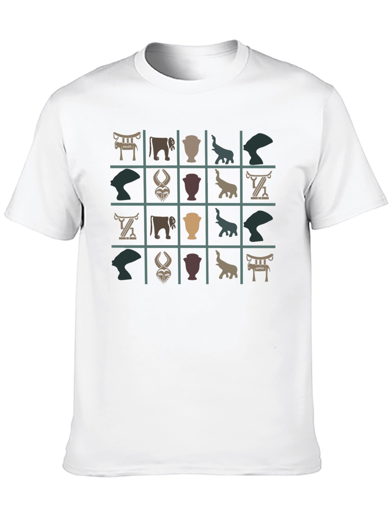 This stylish black t-shirt features a unique grid pattern comprised of cultural symbols. The design includes various brown and beige colored shapes, creating an interesting visual effect. Made from a soft and comfortable material, it's perfect for casual wear. The t-shirt is a great conversation starter and adds a touch of personality to any outfit. Ideal for those who appreciate art and cultural patterns, this t-shirt is a must-have addition to your wardrobe. Wear it with jeans for a relaxed look or dress it up with a jacket for a more polished style.