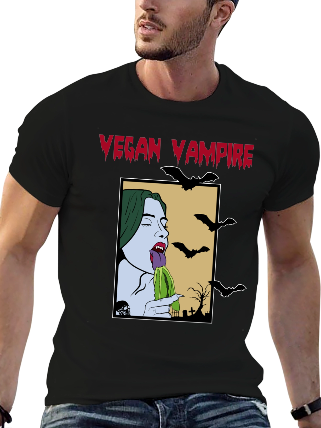 Embrace your unique style with this eye-catching black t-shirt featuring a striking "Vegan Vampire" graphic. The design showcases a cartoonish vampire figure enjoying a green vegetable, set against a Halloween-themed backdrop with bats and tombstones. The vivid colors and intricate details make this tee a standout piece. Made from a comfortable and breathable fabric, this shirt is perfect for casual wear, Halloween events, or expressing your vegan lifestyle with a touch of dark humor. Pair it with jeans, shorts, or your favorite leggings for a cool and edgy look. This graphic tee is sure to spark conversations and add a playful twist to your wardrobe.