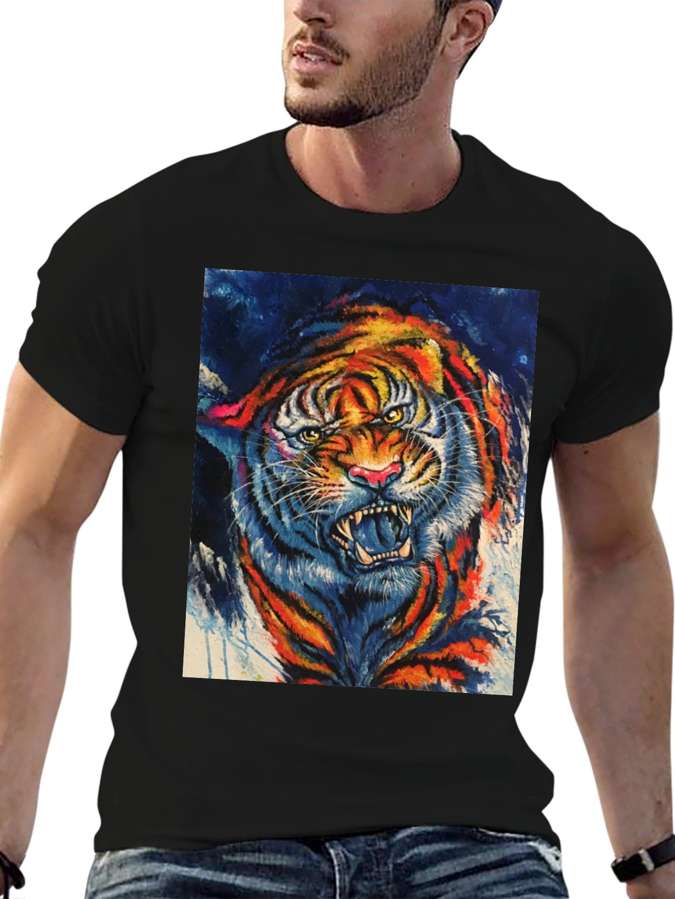 Unleash your wild side with this striking black T-shirt featuring a vibrant, artistic tiger graphic. The detailed print showcases a snarling tiger with an intense gaze, rendered in a vivid mix of blues, oranges, and yellows. The design has a painterly quality, with watercolor-like details creating depth and movement. Made from a soft, comfortable-looking fabric, this tee is perfect for casual wear, making a statement wherever you go. Pair it with jeans or shorts for an effortlessly cool, edgy look. The graphic tee is the ideal way to express your unique style and love for wildlife.