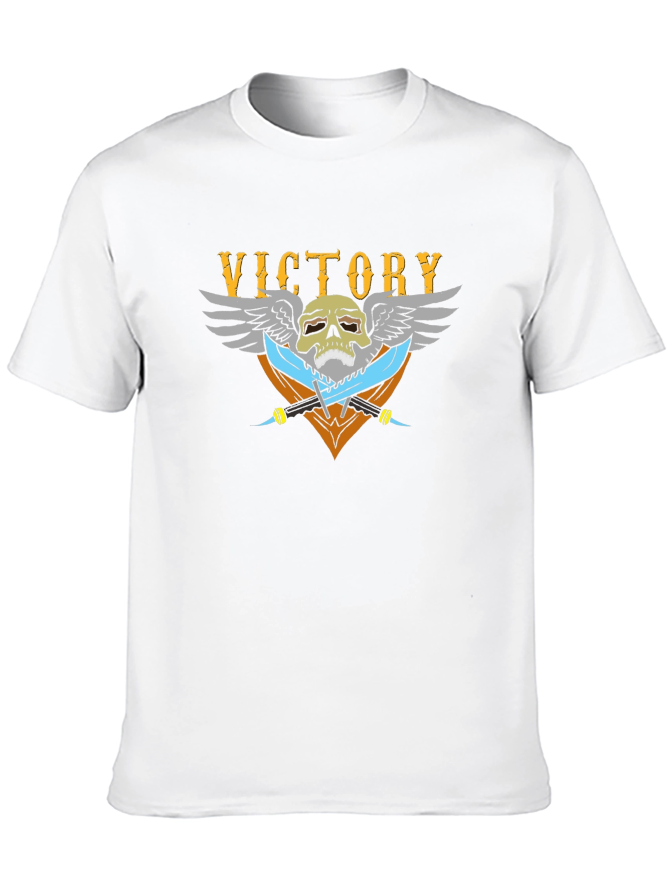 Show your winning spirit with this bold black t-shirt. The front features a striking graphic of a skull with wings, crossed swords, and the word "VICTORY" emblazoned above. The design boasts a vintage, edgy style, perfect for those who want to make a statement. Crafted from a comfortable-looking fabric, this tee is ideal for casual wear, concerts, or expressing your unique personality. Pair it with jeans or shorts for a relaxed yet stylish look. A must-have for anyone who embraces a rebellious aesthetic.