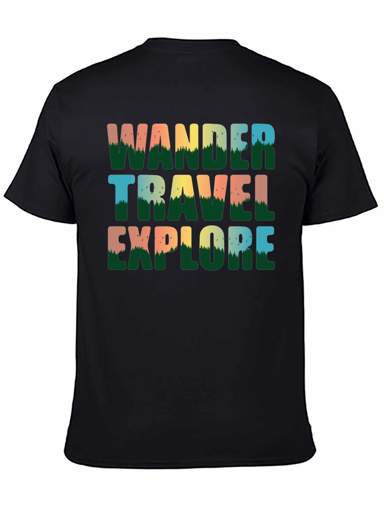 Embrace your adventurous spirit with this stylish black graphic tee. Featuring the words 'Wander, Travel, Explore' stacked vertically in eye-catching gradient colors. Designed with mountain silhouette details inside the letters, the tee evokes a sense of nature and exploration. Made from a soft fabric, this shirt offers both comfort and style, making it perfect for everyday wear or outdoor adventures. Show off your love for travel and discovery with this must-have piece.