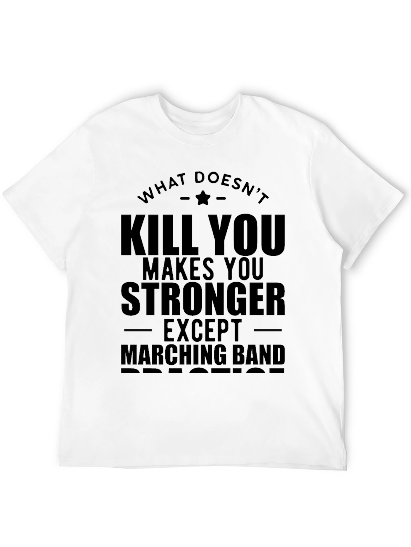 This black t-shirt features a bold statement: "What Doesn't Kill You Makes You Stronger - Except Marching Band Practice." Made from comfortable, breathable fabric, this tee is perfect for marching band members, musicians, or anyone with a sense of humor. The design is printed in a clear, easy-to-read font. This tee makes a great gift for band students or instructors, highlighting the rigorous demands of marching band in a lighthearted way. It's an ideal casual wear item for practices, rehearsals, or everyday activities. Show off your marching band pride with this unique and amusing t-shirt!