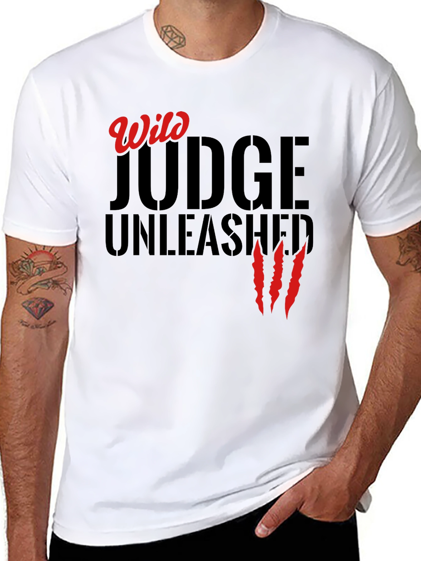 Unleash your wild side with this striking black graphic tee. The design features the words "Wild" in red script above "JUDGE UNLEASHED" in bold, stenciled lettering. Three vibrant red claw marks add a touch of fierce energy. Made from comfortable, breathable material, this shirt is perfect for casual wear, concerts, or expressing your unique style. Stand out from the crowd and make a statement with this edgy and expressive tee. The classic black color ensures it pairs effortlessly with jeans, shorts, or your favorite bottoms. Show off your inner beast with this must-have tee!