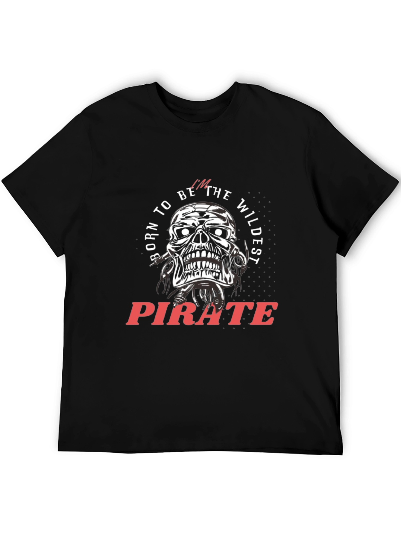 Unleash your inner rebel with this striking men's black t-shirt! Featuring a bold skull graphic with 'Born to be the Wildest Pirate' text, this tee makes a powerful statement. The detailed skull design, combined with the vibrant pirate text, creates a visually captivating look. Made from comfortable, breathable fabric, this t-shirt is perfect for everyday wear or making a statement at parties and gatherings. Pair it with jeans or shorts for a cool, casual style. Stand out from the crowd and show off your unique personality with this eye-catching graphic tee.