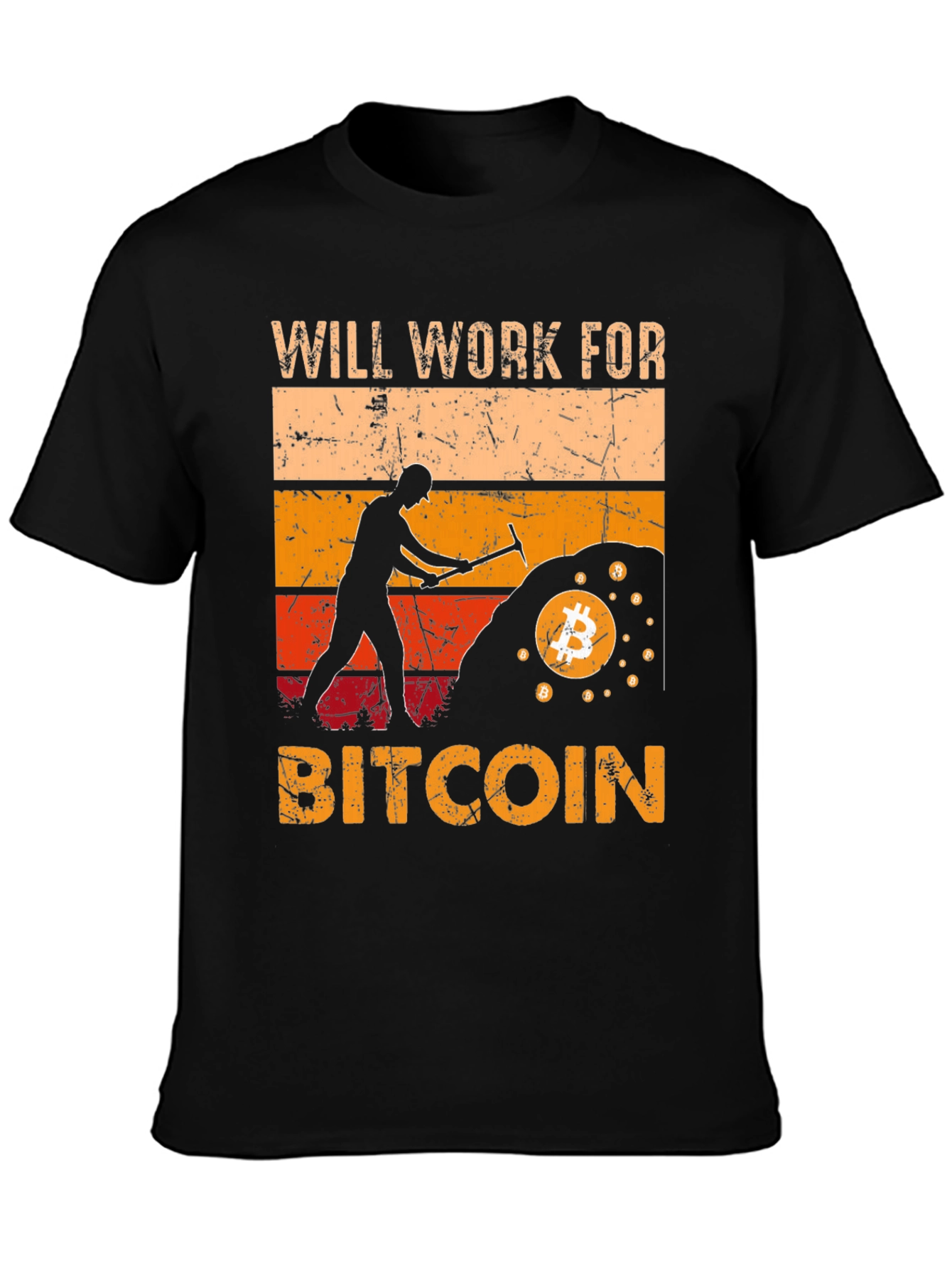 Show your passion for cryptocurrency with this stylish black t-shirt! The shirt features a retro-inspired graphic of a miner digging for Bitcoin, along with the text "Will Work For Bitcoin." The design uses distressed fonts and vibrant shades of orange and brown, creating a vintage feel. Made from comfortable fabric, this tee is perfect for casual wear, crypto meetups, or as a conversation starter. The relaxed fit makes it ideal for everyday use, expressing your enthusiasm for digital currency in a fashionable way. Get yours today and let everyone know you're a Bitcoin believer!