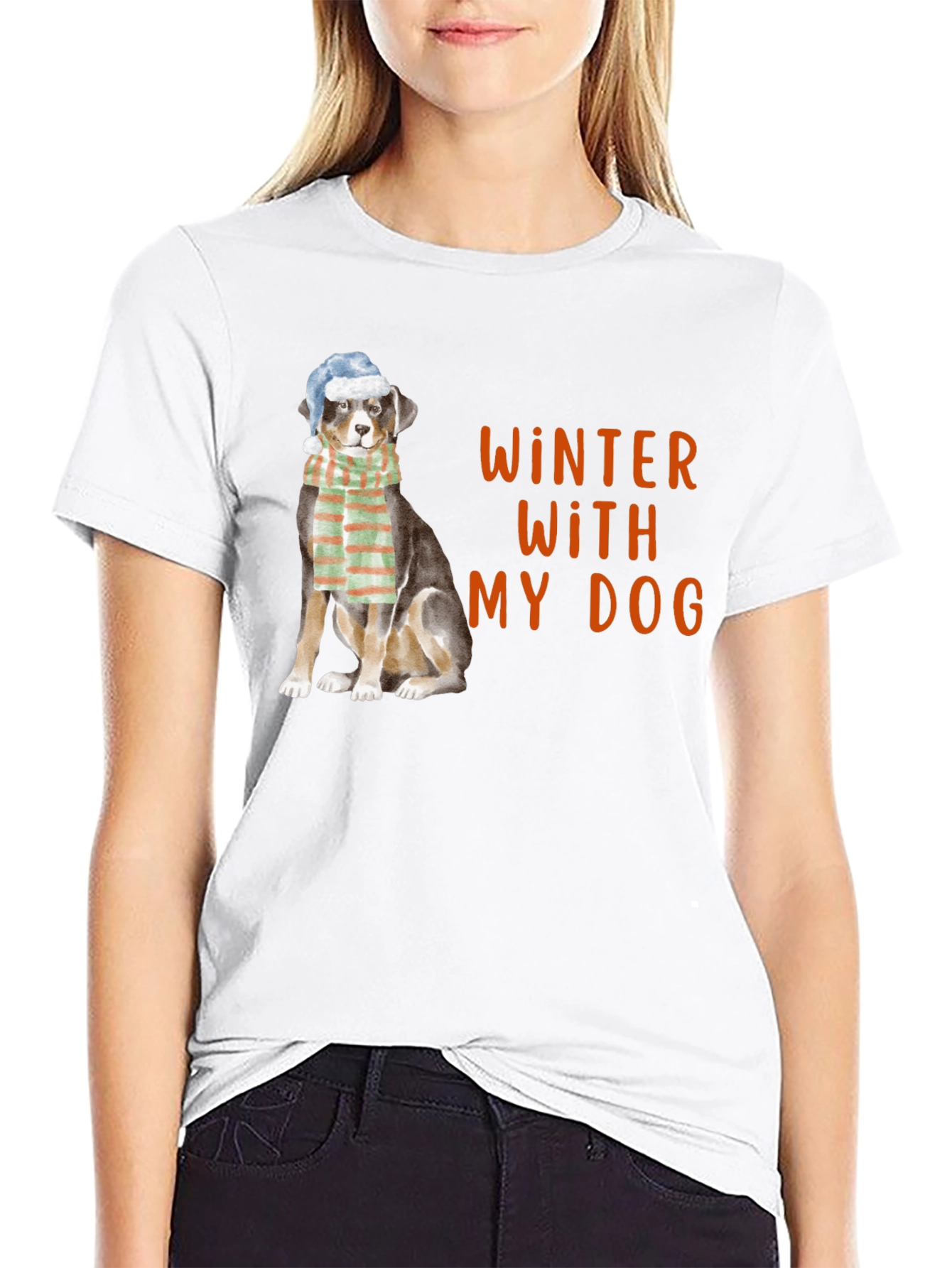 Show off your love for your furry friend with this eye-catching black t-shirt. The shirt features a cute dog wearing a winter hat and scarf with the phrase 'Winter With My Dog' in a warm, orange color. The design is perfect for dog lovers and winter enthusiasts alike. Made from a soft, comfortable fabric, this t-shirt is ideal for everyday wear. Whether you're going for a walk in the park or relaxing at home, this shirt is a stylish and comfortable choice. Get yours today and celebrate the winter season with your beloved dog!