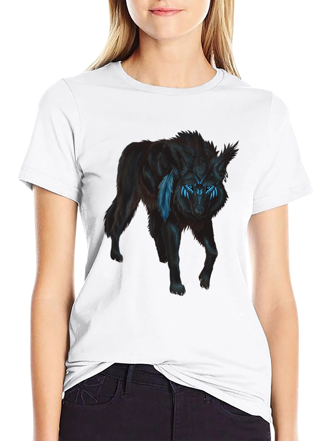 Show off your wild side with this striking black t-shirt featuring a captivating wolf graphic. The design showcases a black wolf with intricate blue details around its eyes, adding a touch of mystique. Made from a comfortable, breathable fabric, this shirt is perfect for everyday wear. Its classic fit makes it a versatile addition to any wardrobe. Wear it casually with jeans or dress it up with a jacket for a night out. A must-have for animal lovers and those who appreciate unique graphic designs. Express your individuality with this eye-catching tee!