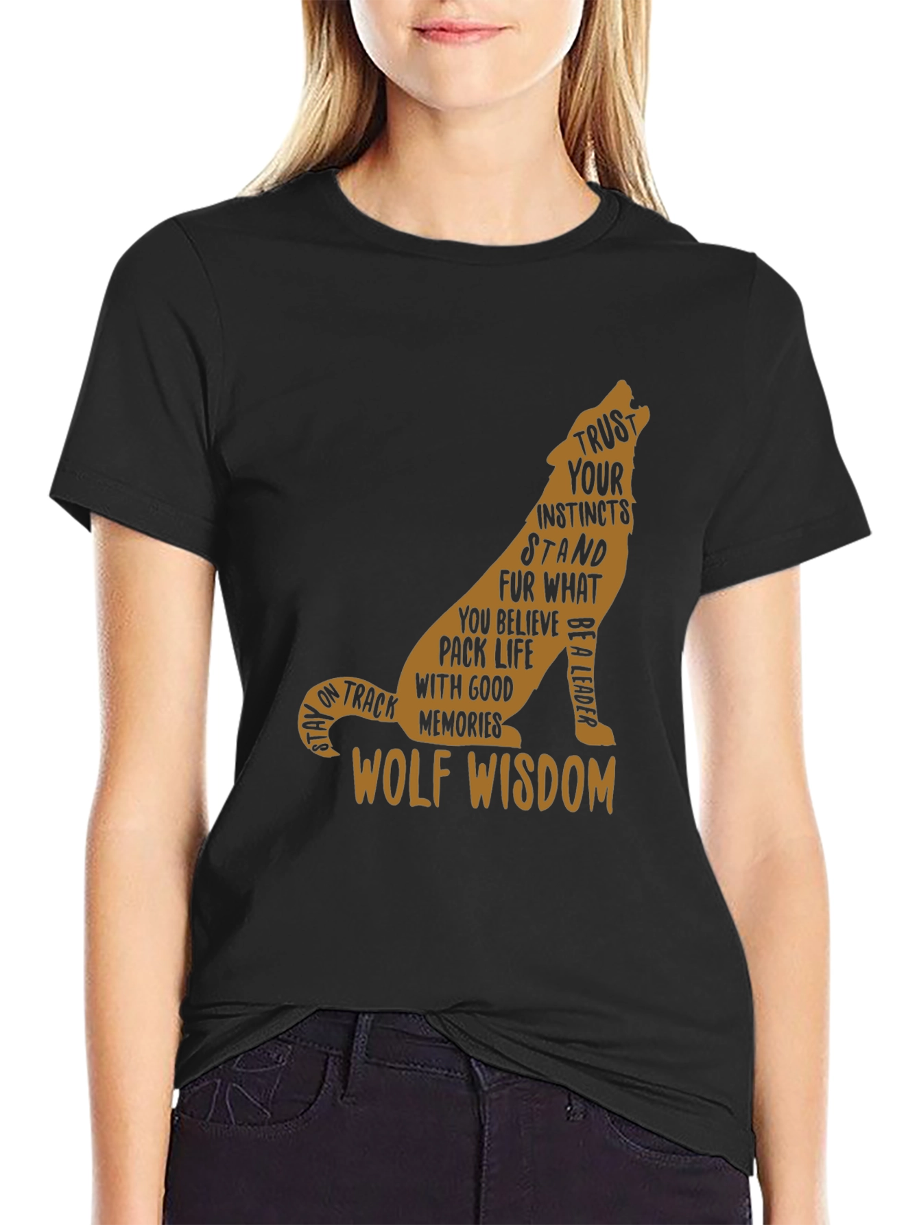 Showcase your inner strength and wisdom with this unique black graphic tee. The design features a wolf silhouette filled with empowering words like "Trust Your Instincts", "Stand For What You Believe", and "Wolf Wisdom". The golden brown text stands out boldly against the black of the t-shirt, ensuring this garment is both stylish and a statement piece. Perfect for casual outings, weekend adventures, or simply expressing your individuality, this t-shirt is sure to become a favorite in your wardrobe. Comfortable, durable, and inspiring, it embodies both fashion and meaning.