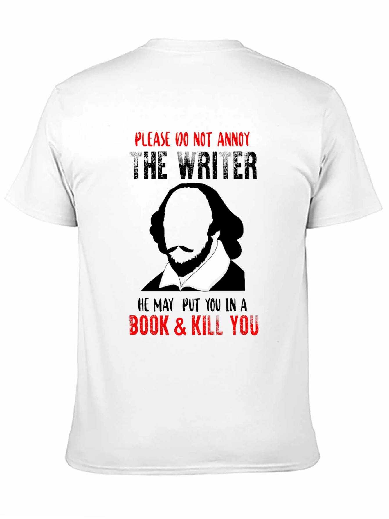 Show off your witty side with this writer-themed T-shirt! This black tee features a silhouette of a writer with a humorous warning in red: "Please Do Not Annoy The Writer, He May Put You In A Book & Kill You". Made from a comfortable fabric blend, this tee is perfect for casual wear, writing meetups, or just lounging around the house. It's a fun way to express your love for literature and a lighthearted way to warn others. This tee would make a great gift for the writers in your life! Get yours today and let your shirt do the talking!