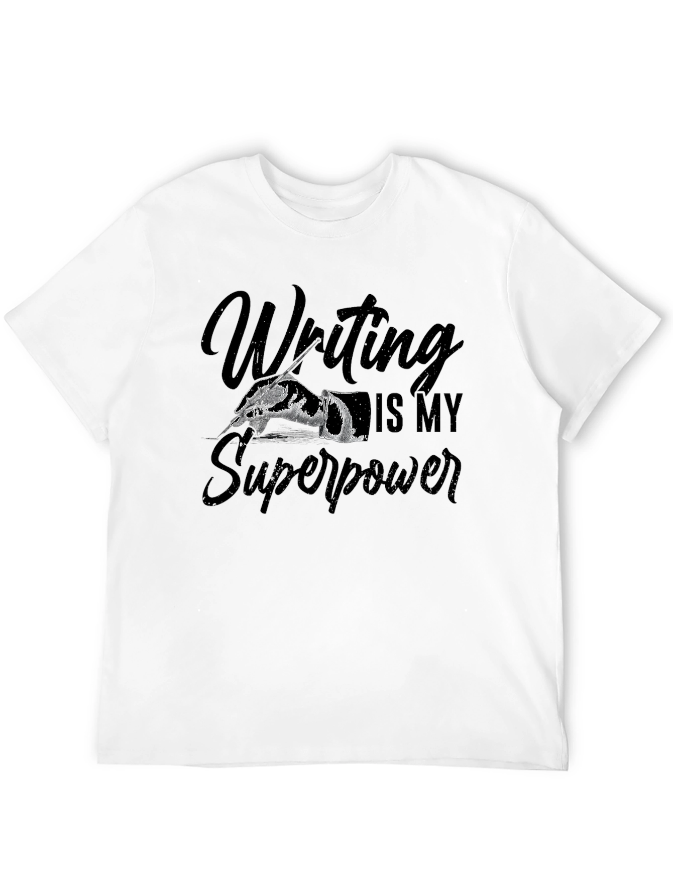 Showcase your passion for writing with this stylish black graphic tee. The shirt features a bold print that reads "Writing is my Superpower," accompanied by a hand holding a pen. Crafted from soft, comfortable fabric, this tee is perfect for everyday wear. Whether you're a seasoned author, a budding journalist, or simply love jotting down your thoughts, this shirt is a great way to express your creative side. Pair it with jeans or shorts for a casual look, or dress it up with a blazer for a more polished style. Available in various sizes.