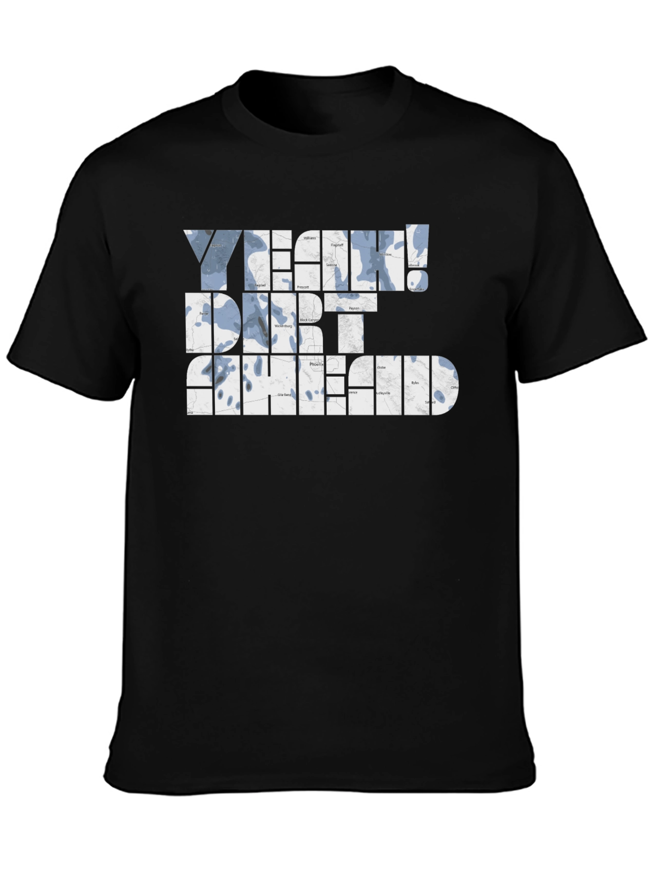 This black graphic t-shirt features the phrase "Yeah! Dirt Ahead" in a bold, unique design. The letters appear to be filled with a textured pattern, giving the shirt a standout look. Made from a comfortable, likely cotton blend, this tee is perfect for casual wear and outdoor adventures. It's a great choice for those who love off-roading, motor sports, or any activity that embraces getting dirty. The classic crew neck and short sleeves make it a versatile addition to any wardrobe. Show off your adventurous side with this eye-catching shirt!