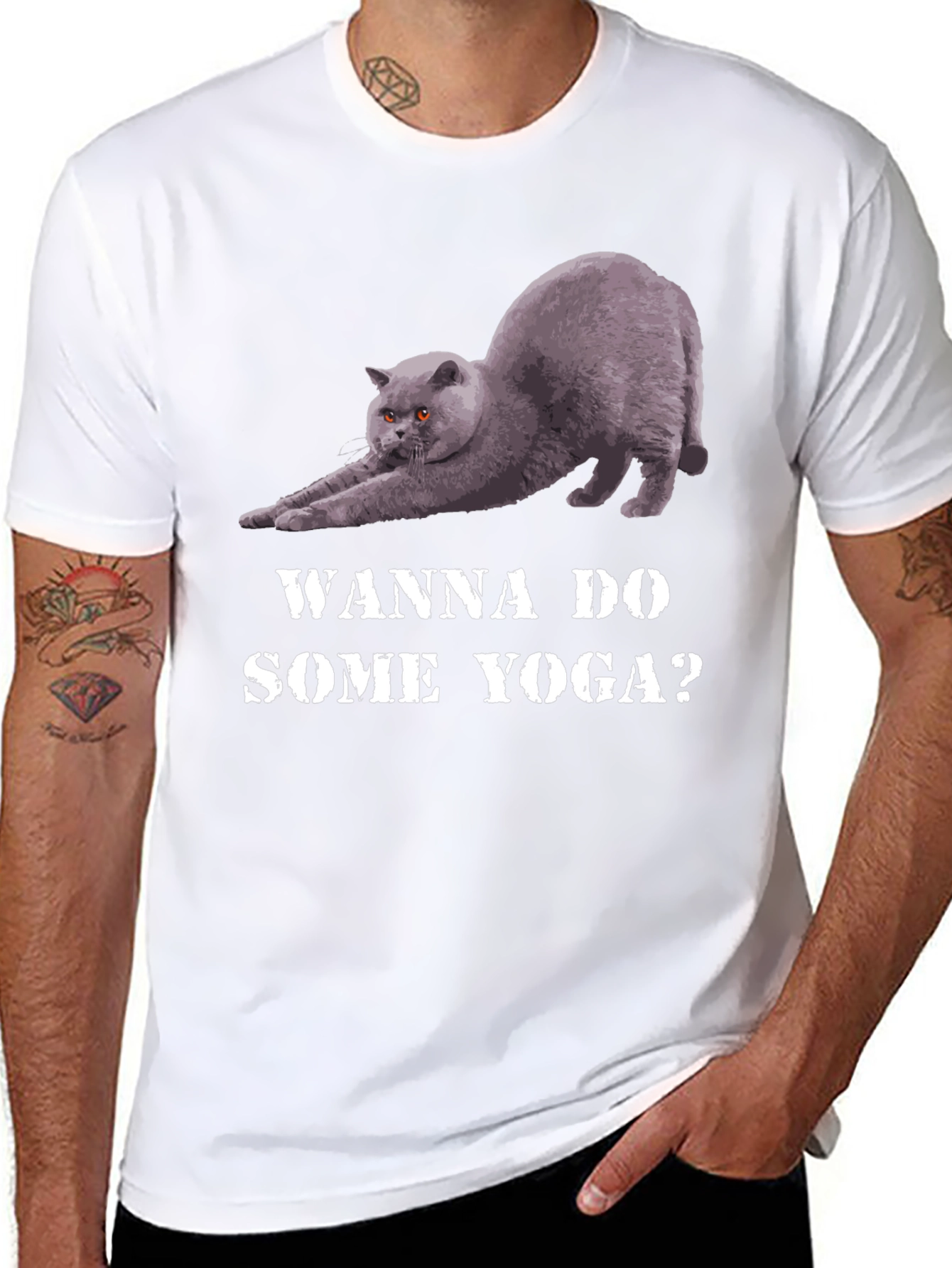 This black t-shirt features a fun and playful design for cat and yoga lovers. The graphic showcases a grey cat in a yoga-like stretch pose, accompanied by the text "WANNA DO SOME YOGA?" in a bold, distressed font. The shirt appears to be made from a comfortable, soft fabric, perfect for everyday wear or a light workout. The short sleeves and classic fit make it a versatile addition to any casual wardrobe. Wear it to your next yoga class or while lounging at home to show off your love for cats and yoga.