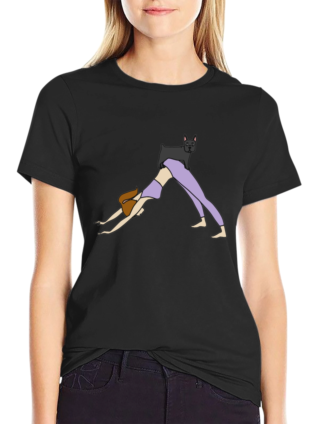 This unique black t-shirt features a playful illustration of a woman in a downward dog yoga pose, with a cute black dog perched on her back. Made from a comfortable-looking fabric, this tee is perfect for yoga enthusiasts and dog lovers alike. The design is simple yet eye-catching, making it a great conversation starter. Whether you're heading to a yoga class, a casual outing, or simply relaxing at home, this t-shirt is a fun and stylish choice. Show off your love for yoga and dogs with this one-of-a-kind tee!