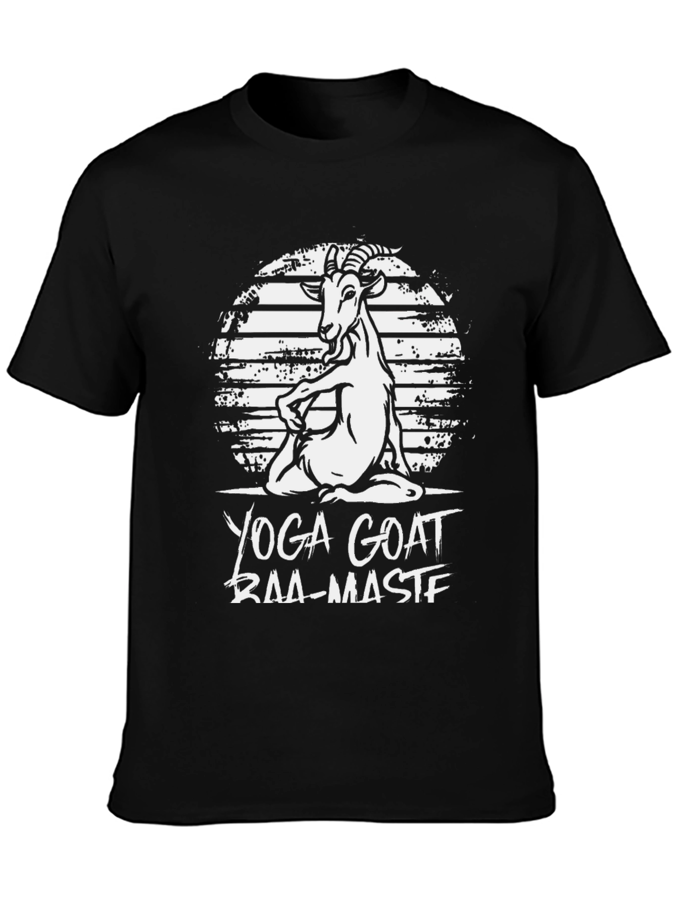 This black t-shirt features a striking white graphic of a goat in a yoga pose, set against a stylized sun or moon background. The words 'YOGA GOAT' are printed above, with 'BAA-MASTE' underneath, adding a playful twist to the design. Made from a comfortable-looking material, this shirt is ideal for yoga enthusiasts, animal lovers, or anyone who enjoys quirky, eye-catching apparel. Perfect for casual wear, workouts, or as a fun conversation starter. Show off your unique sense of humor with this Yoga Goat T-shirt!