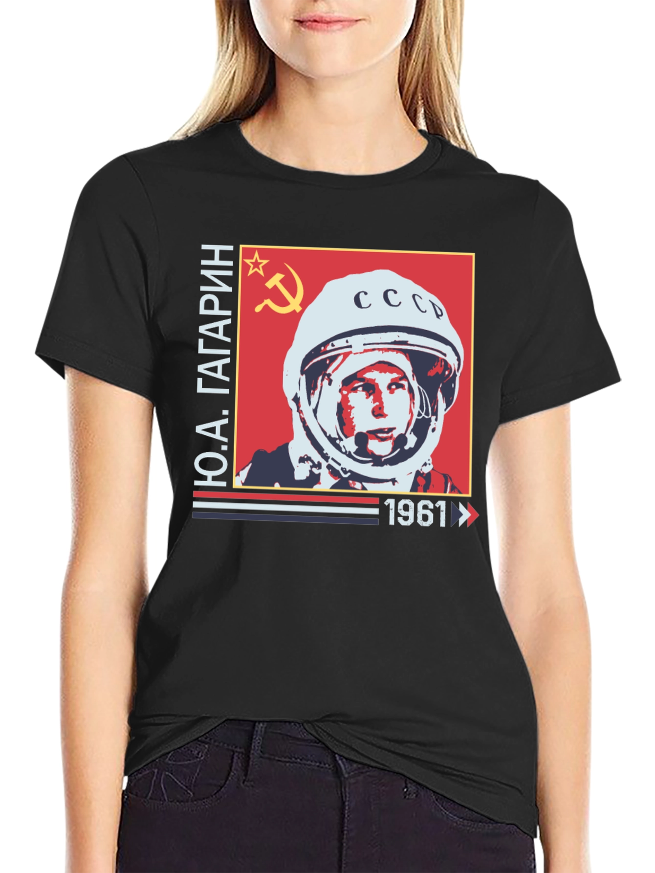 Show your love for space history with this unique t-shirt. This black tee features a striking graphic of Yuri Gagarin, the first human in space. The design incorporates the iconic Soviet symbols, a red backdrop, and the year 1961, commemorating Gagarin's historic flight. Made from a comfortable fabric, this shirt is perfect for casual wear, space enthusiasts, or anyone with an appreciation for historical milestones. Wear it to show your passion for space exploration and Soviet history. A conversation starter and a stylish addition to any wardrobe!
