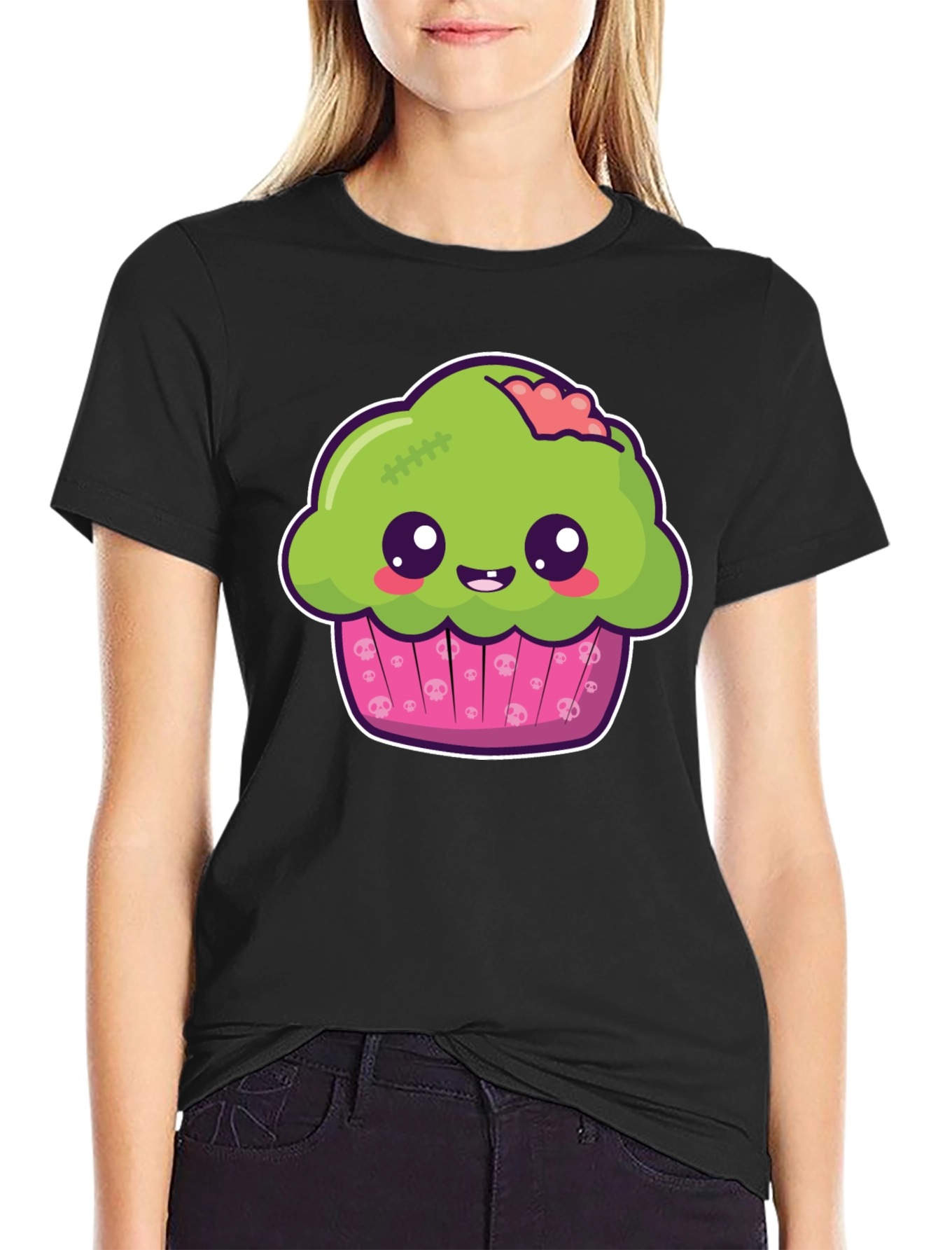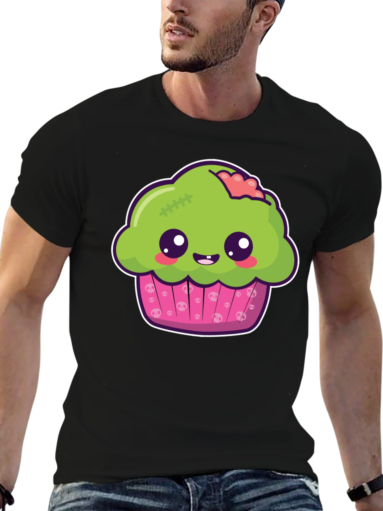 This black t-shirt features a fun and spooky graphic print of a zombie cupcake. The cupcake has green frosting, cute eyes, and a pink base adorned with skulls, creating a playful yet eerie aesthetic. Made from a comfortable fabric, this tee is perfect for casual wear or Halloween-themed events. Its unique design makes it a standout piece, ideal for those who love quirky and alternative fashion. Show off your fun side with this eye-catching zombie cupcake tee! It's a great conversation starter and a must-have for any fan of zombies, sweets, or Halloween.
